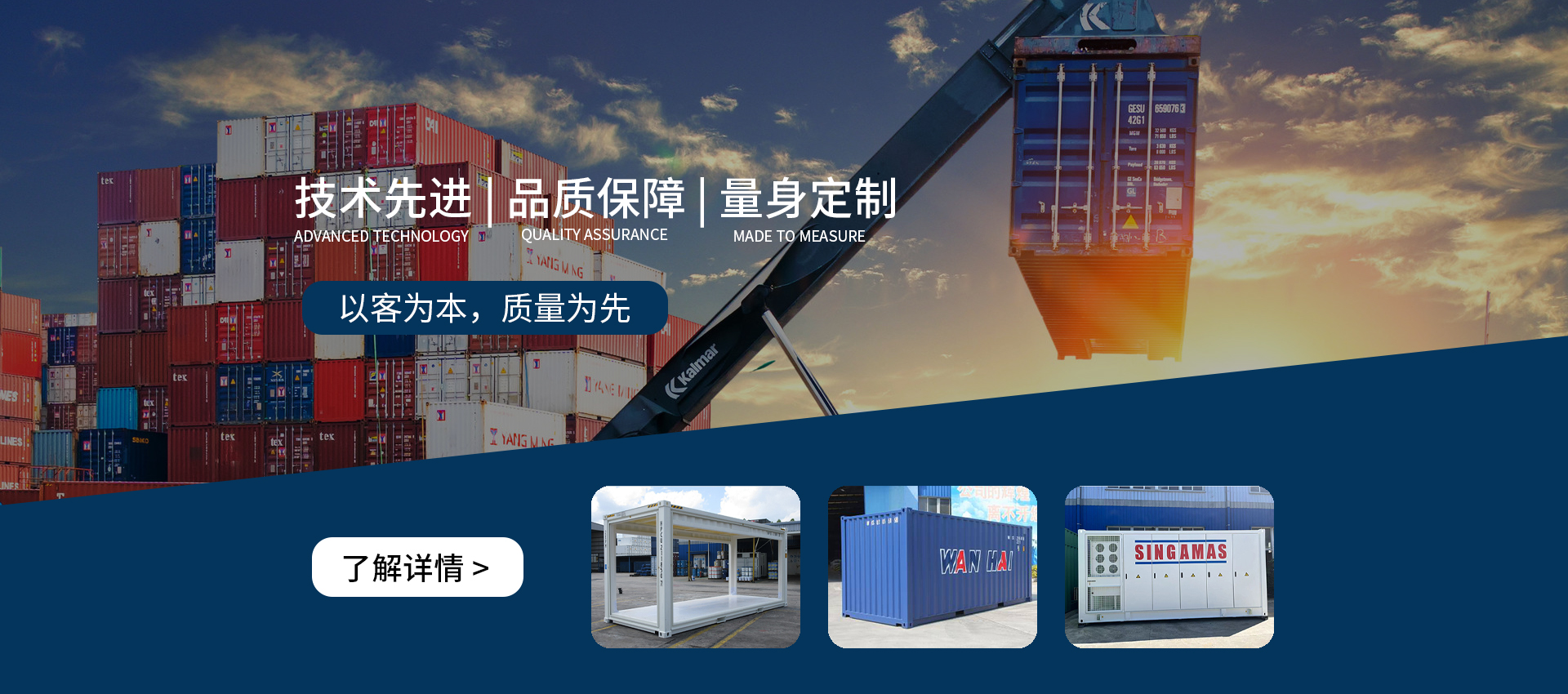 公司位于同安工業集中區,占地150多畝,注冊資本2300萬美元,員工近1000名,擁有五十三多項技術專利,建有標準箱和定制箱生產線及專用集成車間,單班年產能可達十五萬標準箱。憑借自身合理完善的運營機制,公司除獲得包括中國船級社在內的國際各大船級社的認證外,還通過了ISO質量管理體系和環境管理體系認證......